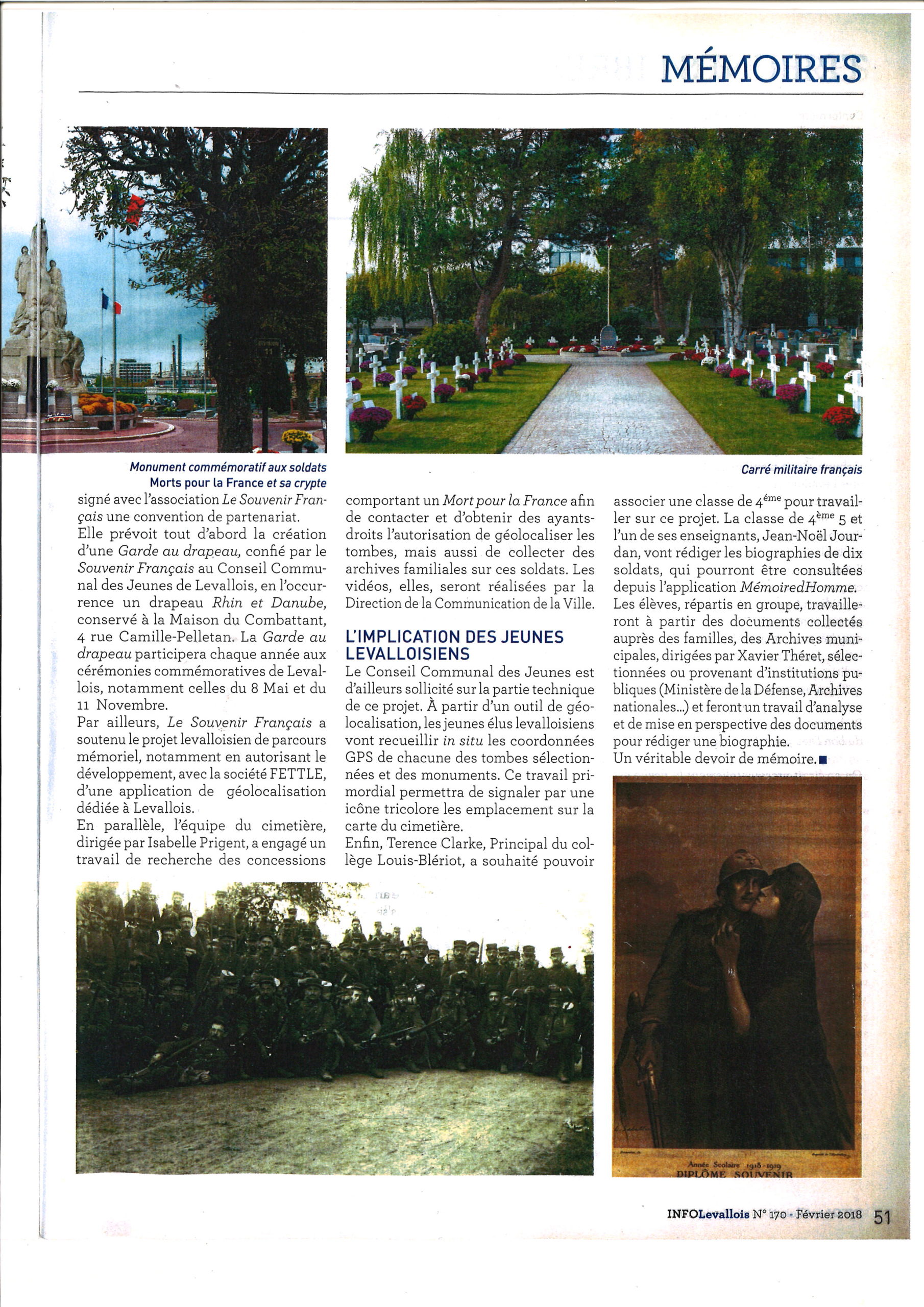 Le collège Jean Moulin et les élèves de 3e de la Classe Défense. Ceux sont eux, aidés de leur enseignante, Madame de Schaetzen, qui ont rédigé les fiches biographiques des combattants « Morts pour la France ». Ils ont géolocalisé et photographié chaque tombe.