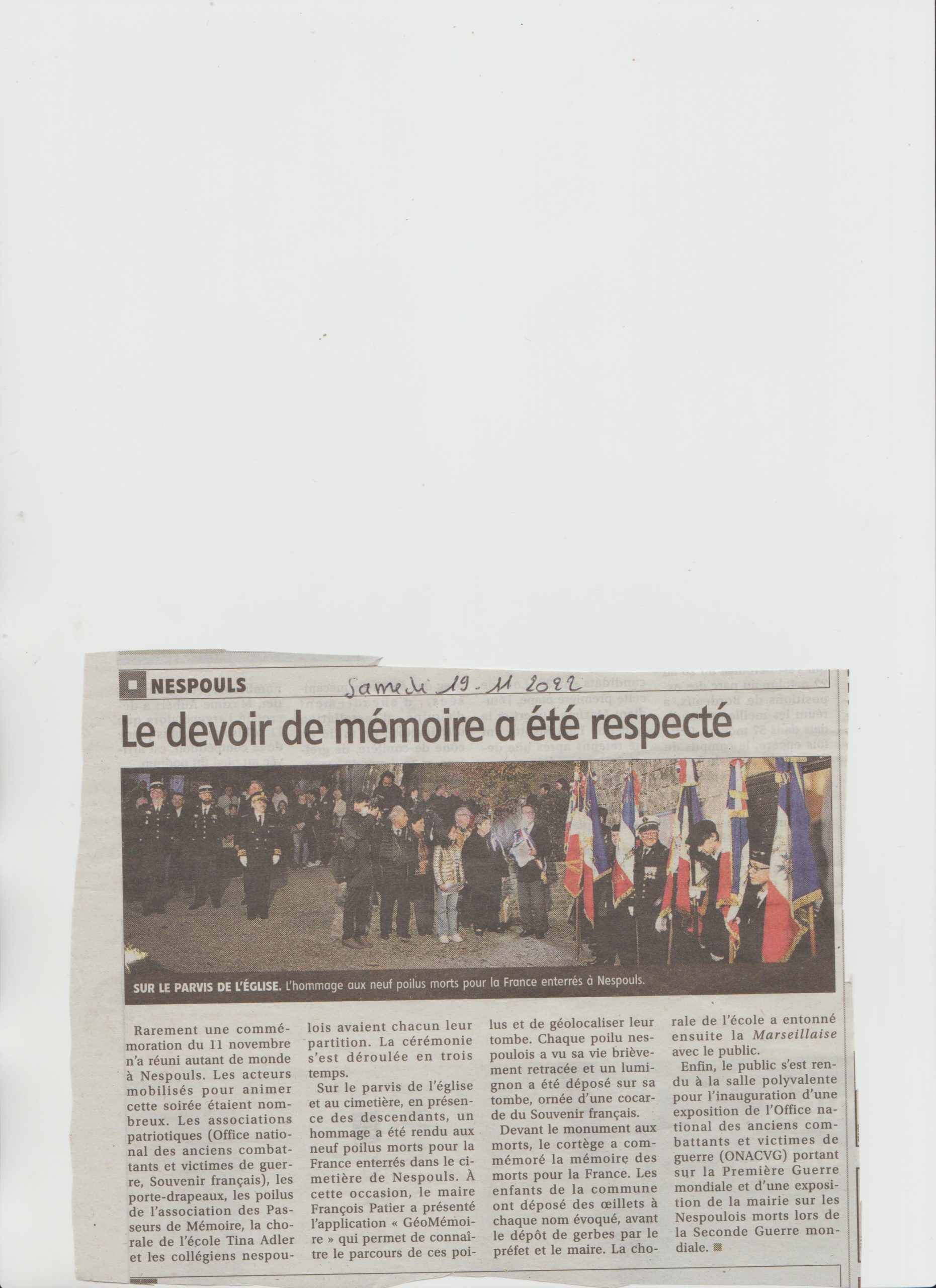 Le jeudi 10 novembre 2022, inauguration du projet GéoMémoire à L’Isle-en-Dodon en Haute-Garonne, sous un soleil radieux. Le projet a été initié et mis en œuvre par le Président du comité local, Roland Lévêque, les membres de son bureau, et Patrick et Joelle Gaston chargés des recherches biographiques. L’inauguration a été présidée par Monsieur Lionel Welter, Maire de l’Isle en Dodon, accompagné par le