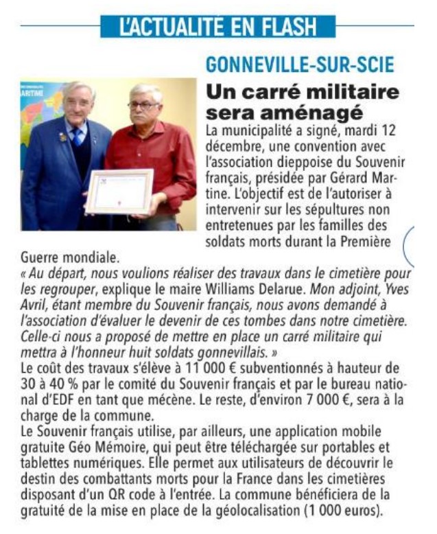Le 11 novembre 2022 a été inauguré le projet de restauration du carré militaire d’Hautot-sur-Mer en Seine-Maritime. Le siège du Souvenir Français a réalisé gratuitement l’intégration des fiches biographiques des combattants « Morts pour la France » enterrés là, dans l’application mobile GéoMémoire. C’est le premier cimetière du département intégré.