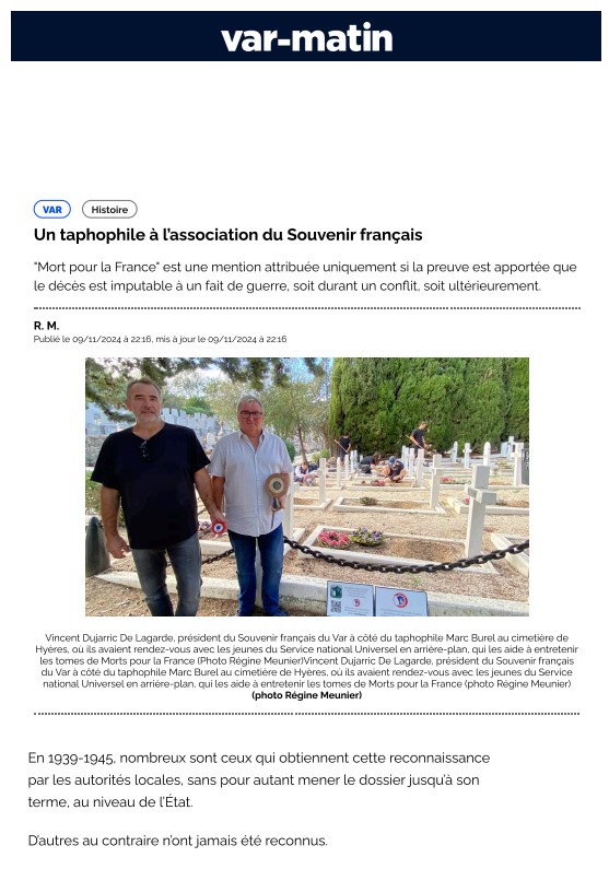 Le 25 juin 2023, le carré militaire communal de Bracieux, dans le Loir-et-Cher, fraichement rénové, a été inauguré. A cette occasion, le siège du Souvenir Français a proposé à titre gracieux, l’écriture et l’intégration des fiches biographiques des combattants « Morts pour la France » inhumés là.