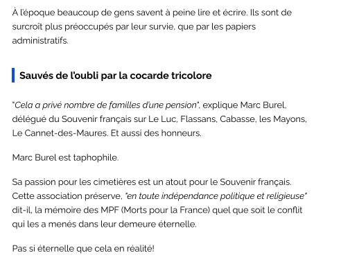 Après des travaux de restauration du carré militaire communal entrepris par le comité de Mont-de-Marsan du Souvenir Français et la municipalité, le siège du Souvenir Français a proposé l’écriture et l’intégration des fiches biographiques des combattants « Morts pour la France » inhumés là. Vous pouvez désormais les découvrir dans l’application mobile GéoMémoire.