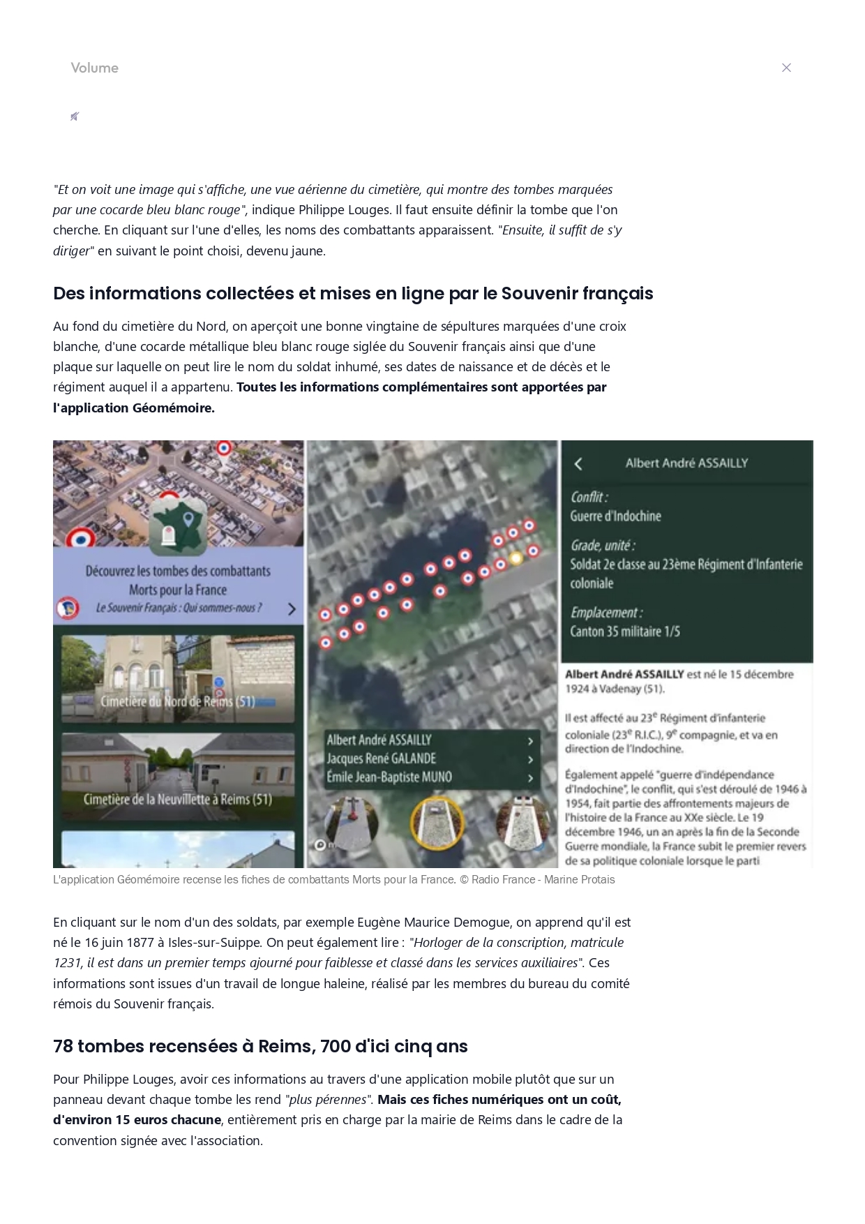 Dans les cimetières géolocalisés, les promeneurs repèrent ces tombes à l’aide d’une cocarde tricolore sur une carte. En cliquant sur cette dernière, ils ont accès à la fiche biographique du combattant, rédigée par un ou une historien(ne), un ou une généalogiste, des photographies, des documents d’archives, un audio, etc.