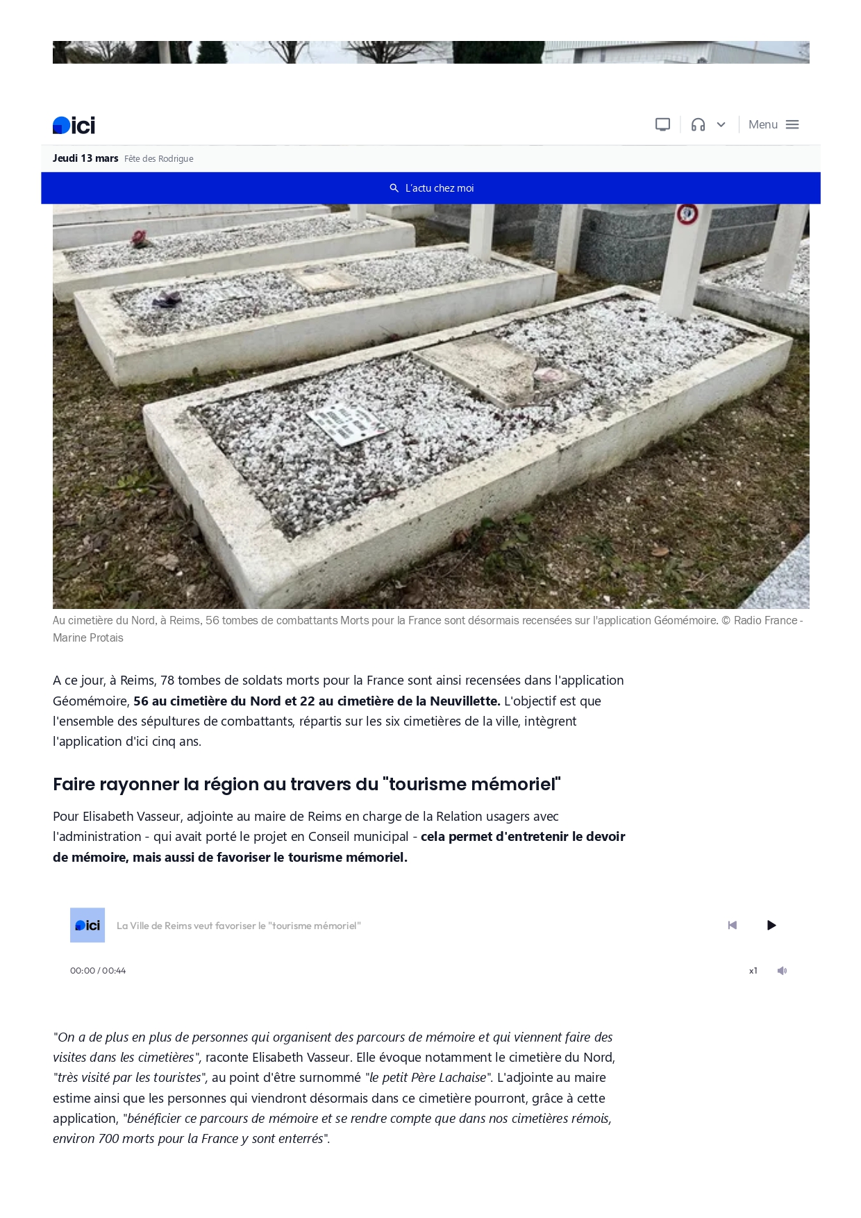 Le mercredi 8 mars 2023, inauguration du projet GéoMémoire à Cormontreuil, présence du Président Général du Souvenir Français, le CGA(2s) Serge Barcellini. Le comité rémois du Souvenir Français a alimenté l’application GéoMémoire : les 35 tombes des « Morts pour la France » du cimetière de Cormontreuil y sont recensées et disponibles, grâce au travail de recherche historique de Jean Vigouroux, membre du comité local.