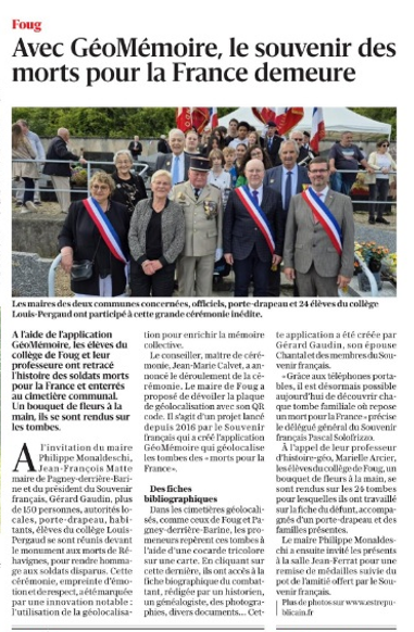 Le vendredi 23 septembre 2022, cérémonie d’inauguration du projet GéoMémoire au cimetière de Val-et-Châtillon en Meurthe-et-Moselle. Seize fiches présentant les biographies de seize combattants inhumés dans le cimetière communal sont désormais à découvrir dans l’application mobile.