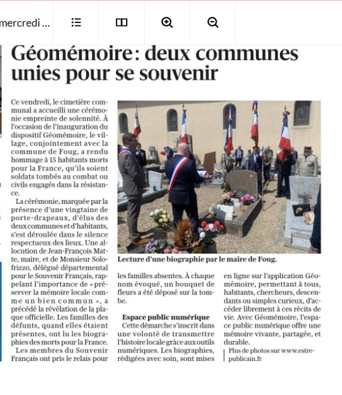 Le vendredi 23 mai 2025 à 16h, cérémonie d’inauguration du projet GéoMémoire au cimetière de Réhavignes à Foug en Meurthe-et-Moselle. Vingt-cinq fiches présentant les biographies de vingt-cinq combattants inhumés dans le cimetière communal ont été réalisées par le Comité de Toul du Souvenir Français. Vous pouvez désormais les découvrir dans l’application mobile.