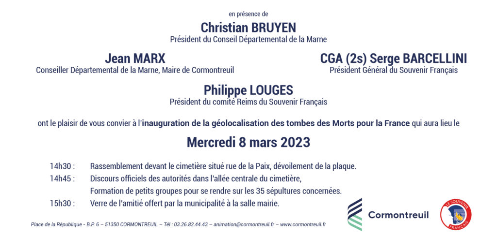 Le mercredi 8 mars 2023, inauguration du projet GéoMémoire à Cormontreuil, présence du Président Général du Souvenir Français, le CGA(2s) Serge Barcellini. Le comité rémois du Souvenir Français a alimenté l’application GéoMémoire : les 35 tombes des « Morts pour la France » du cimetière de Cormontreuil y sont recensées et disponibles, grâce au travail de recherche historique de Jean Vigouroux, membre du comité local.