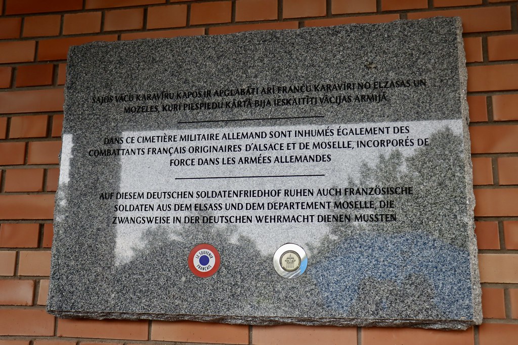 La première plaque a été apposée à l’entrée de la nécropole allemande de Saldus en Lettonie le 25 août 2025. Elle affiche en trois langues un texte simple : « Dans ce cimetière de soldats allemands, sont également inhumés des soldats français alsaciens-mosellans incorporés de force ».