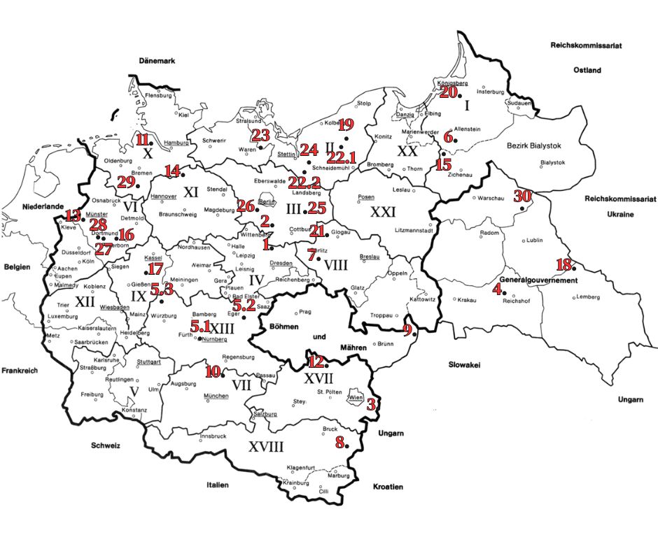 Sur la carte ci-dessus sont renseignés les monuments commémoratifs sur les sites des oflags et des stalags au sein desquels ont été internés des prisonniers de guerre français. Les numéros renvoient à la liste ci-dessous :