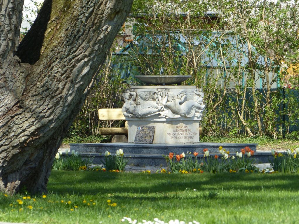 10 – Stalag VII-A, Moosburg an der Isar (Allemagne) : en 1963, année de la signature du Traité franco-allemand de l’Elysée, est inaugurée la « Fontaine française » (Franzosenbrunnen), une fontaine commémorative érigée au milieu de la place du souvenir du Stalag VII-A, dont les bas-reliefs représentent les 4 grands fleuves français et qui a été conçue en 1942/43, durant sa captivité, par Antoniucci Volti (1915-1989), un artiste prisonnier de guerre français d’origine italienne.