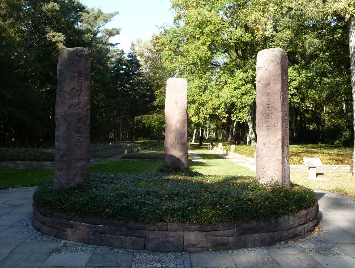 11 – Stalag X-B, Sandbostel (Allemagne) : en 1982, dans le cimetière du camp, sont construits deux monuments. Le premier consiste en un socle circulaire en pierre sur lequel se dressent trois colonnes « Votre sacrifice-Notre devoir-Paix ». Le second est une croix monumentale.