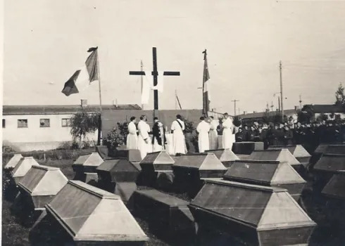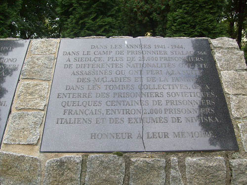 30 – Stalag 366 Siedlce (Pologne) : dans le cimetière militaire soviétique de Siedlce a été érigé une stèle en hommage aux 25 000 prisonniers de guerre soviétiques, et aux 2 000 prisonniers de guerre français et italiens qui ont péri dans le camp. Une plaque en chaque langue y est apposée.
