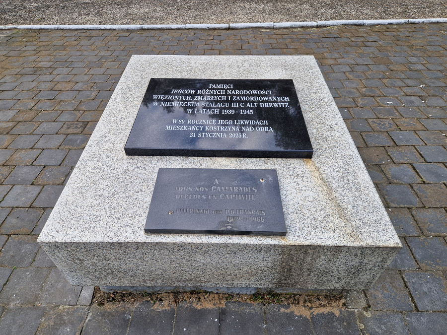 26 – Stalag III-C, Alt-Drewitz/Drzewica (Pologne) : dans le cimetière du camp, un mémorial aux prisonniers de guerre décédés a été érigé, avec un relief de trois bustes d’hommes symbolisant les prisonniers de guerre. Au-dessous de la plaque apposée par les autorités polonaises en 1962, les anciens prisonniers de guerre ont fait apposer une autre plaque en 1966, en hommage à leurs camarades.