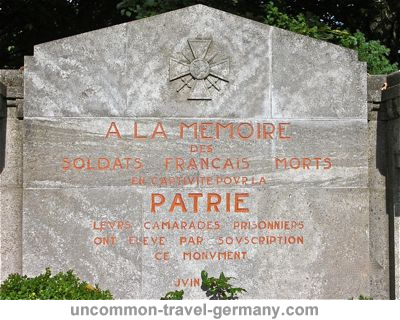 1 – Stalag IV-B, Mühlberg (Allemagne) : dès octobre 1941, l’homme de confiancedu Stalag IV-B décide de rendre hommage aux morts de ce camp. Œuvre de deux officiers internés, le monument se présente sous forme d’une croix massive. Sur l’une des faces est gravée la sentence : Pro patria longe ab ea 1939-194. En 1983 seulement fut rajouté le 5 final. Une urne contenant de la terre de Gergovie, un des grands sites de l’histoire gauloise valorisé par le gouvernement de Vichy, fut scellée sur le monument inauguré en novembre 1944.