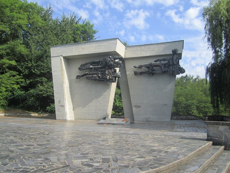 18 – Camp de Rawa Ruska (Ukraine) : les autorités soviétiques font construire une sculpture métallique ainsi qu’une stèle bilingue sur le site de l’ancien camp.