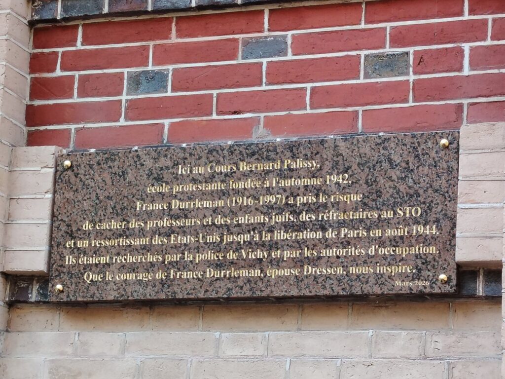 Une plaque a été apposée au 18 rue Eugène Flachat à Paris en hommage à France Durrleman-Dressen, afin de rappeler son action courageuse et discrète pendant la Seconde Guerre mondiale. En 1942, elle y fonde le Cours Bernard-Palissy, qui devient aussi un lieu de refuge où elle cache et protège des personnes juives, notamment des enfants, au sein de réseaux de solidarité protestants. Cette plaque commémore ainsi une forme de résistance civile fondée sur la conscience et l’humanité, et fait écho à la reconnaissance de France Durrleman-Dressen comme « Juste parmi les Nations » en 2023.