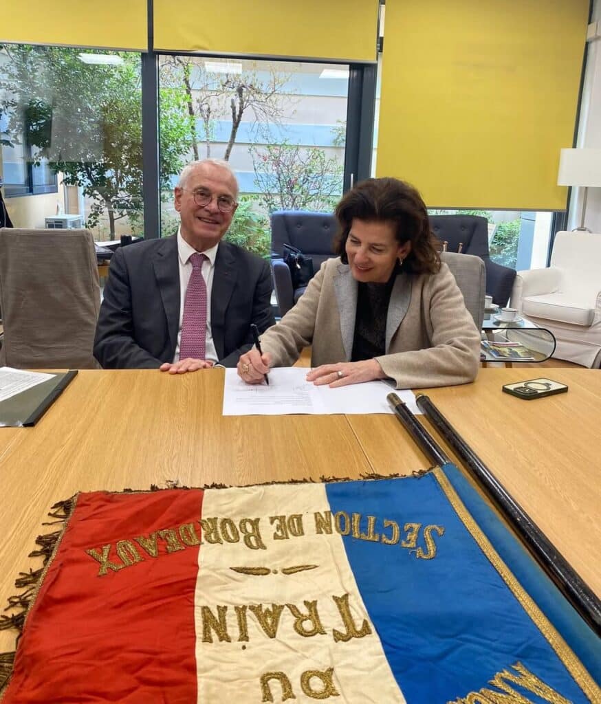 Dépôt d’un drapeau au lycée français Eugène Delacroix à Athènes, en présence de S.E. Laurence Auer, ambassadrice de France en Grèce, et de l’attaché de Défense auprès de l’Ambassade, le capitaine de vaisseau Arnaut Lacote. Le drapeau déposé est celui de l’association des anciens combattants du Train de Bordeaux. Un drapeau que deux faits relient à la Grèce. Tout d’abord, le régiment du Train a joué un rôle essentiel dans le transfert des hommes, des animaux et du matériel entre la France et les Dardanelles en 1915, puis des Dardanelles à Thessalonique en 1916. Quant à Bordeaux, c’est au musée de cette ville qu’est exposé le tableau d’Eugène Delacroix sur les combats de Missolonghi en 1826.