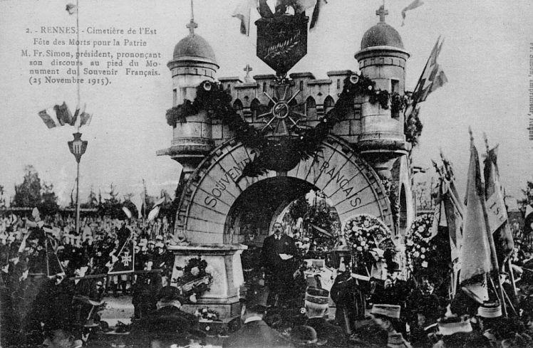 Le 26 novembre 1916, alors que la bataille de Verdun est dans tous les esprits, François (dit Francis) SIMON, alors président du comité du Souvenir Français de Rennes et de l’Escorte d’honneur, dont le fils aîné vient d’être tué au combat, prononce sous l’arche du Monument du Souvenir Français de Rennes, une allocution qui va avoir une importance hautement symbolique. Il émet l’idée que la France doit honorer, au Panthéon, un soldat mort pour la patrie : « Pourquoi la France n’ouvrirait-elle pas ses portes du Panthéon à l’un de ses combattants ignorés, morts bravement pour la Patrie avec deux mots seulement pour inscription sur la tombe : « un Soldat » et deux dates « 1914 – 1917 ? ». Cette inhumation d’un simple soldat, sous le dôme, où reposent tant de gloires et de génies, serait comme un symbole ; et de plus, ce serait un hommage rendu à l’armée française tout entière. ». L’idée de la tombe d’un soldat inconnu est lancée. Ce n’est qu’en 1918 qu’elle est reprise par un député. Au Panthéon, le corps se retrouverait sous terre dans un endroit sombre et discret : il est donc envisagé de choisir un lieu inondé de lumière et à la vue de tous. Après le choix effectué par le soldat Auguste THIN, fils d’un combattant lui-même disparu au cours de la guerre, le 28 janvier 1921, le cercueil du ‘’Soldat Inconnu’’ est inhumé au centre de l’arche principale de l’Arc de Triomphe, face aux Champs Elysées. Le « brave soldat » honoré, chaque soir, par une délégation qui effectue le ravivage de la flamme sacrée, est intimement lié au monument du Souvenir Français de Rennes.