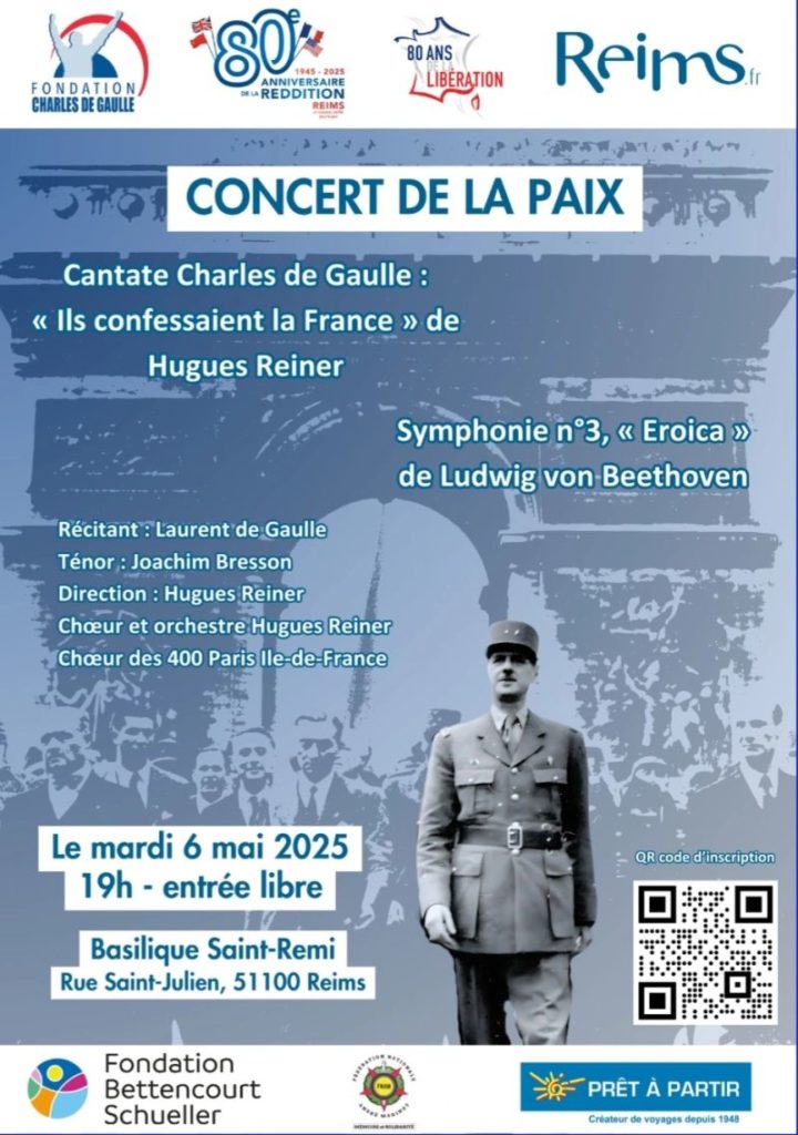 La Fondation Charles de Gaulle et la ville de Reims organisent un concert de la paix avec une interprétation de la Cantate Charles de Gaulle, le mardi 6 mai 2025.