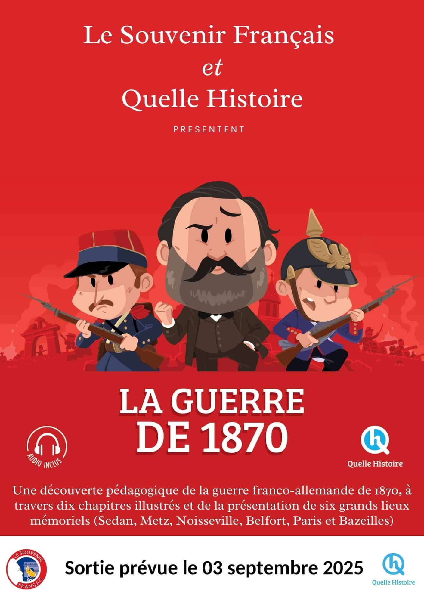 Le Souvenir Français s’est associé à la maison d’édition Quelle Histoire, spécialisée dans la publication de livres et d’applications visant à l’enseignement de l’histoire aux enfants des classes primaires, afin d’élaborer un ouvrage sur la guerre de 1870. Cette brochure est une découverte pédagogique de la guerre franco-allemande de 1870, à travers dix chapitres illustrés et de la présentation de six grands lieux mémoriels (Sedan, Metz, Noisseville, Belfort, Paris et Bazeilles).