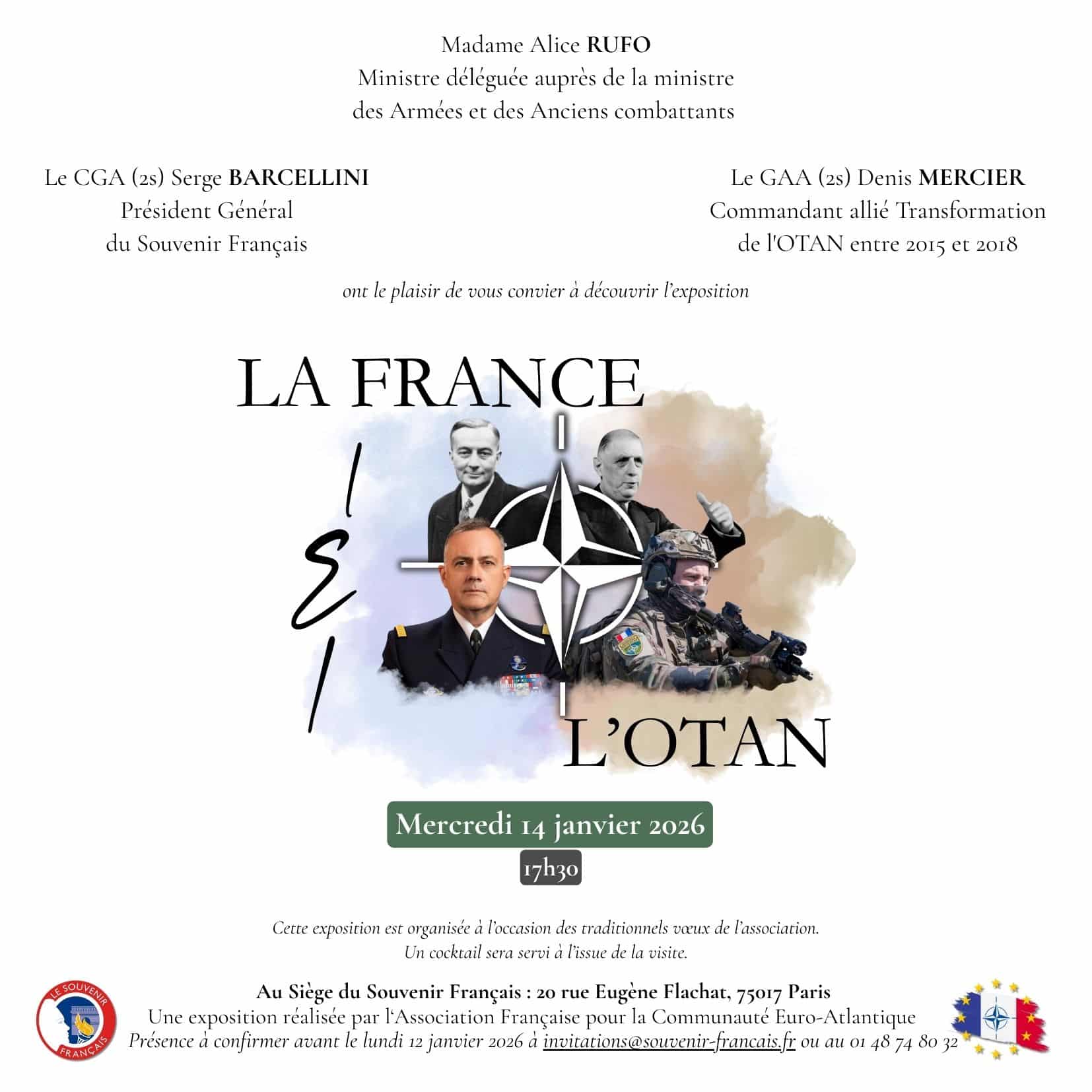 Cette exposition sera inaugurée par Madame Alice Rufo, Ministre déléguée auprès de la ministre des Armées et des Anciens combattants, et par le Général d’armée aérienne (2S) Denis Mercier, Commandant allié Transformation de l’OTAN entre 2015 et 2018, le mercredi 14 janvier à 17h30 au Siège du Souvenir Français : 20 rue Eugène Flachat, 75017 Paris.