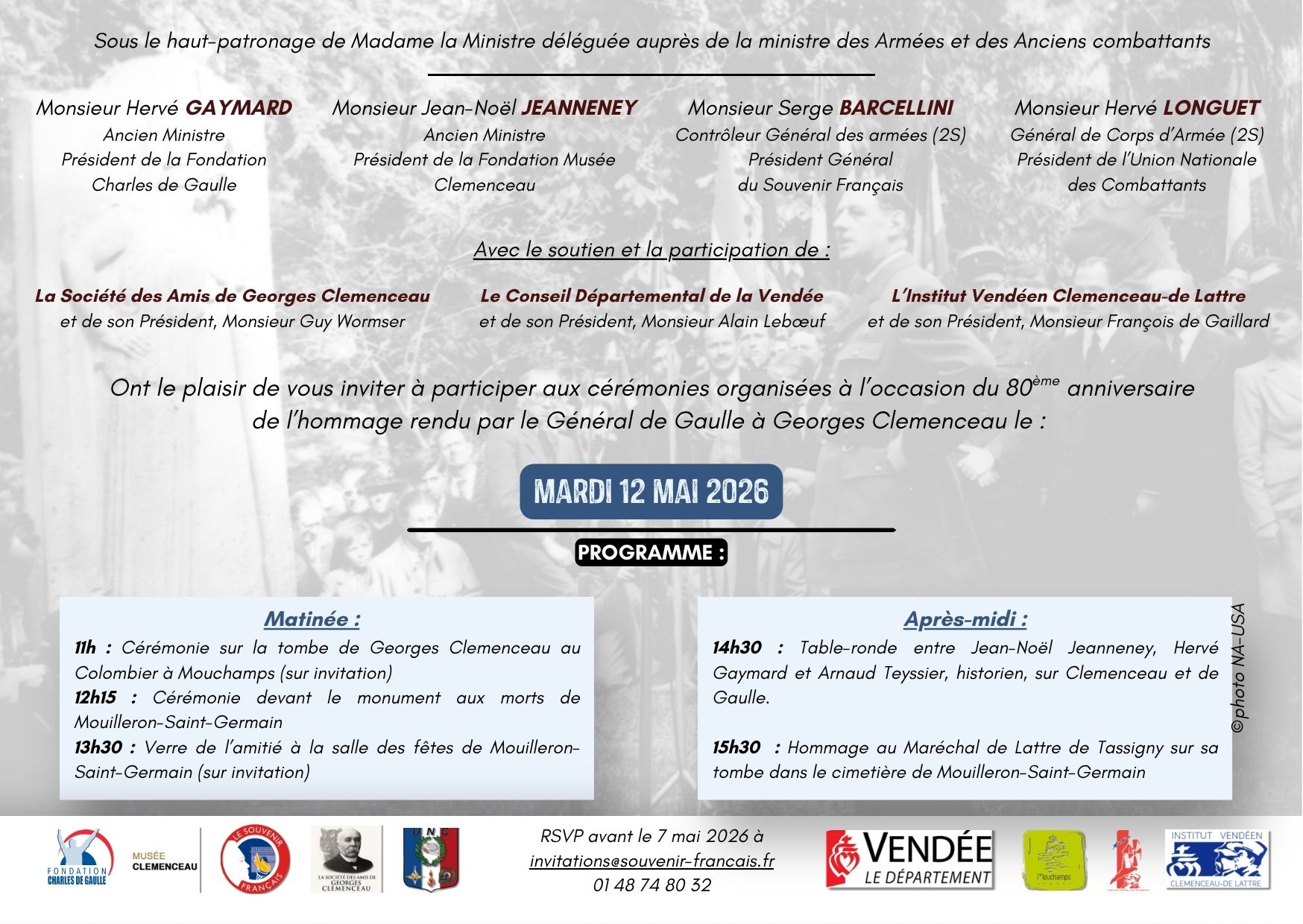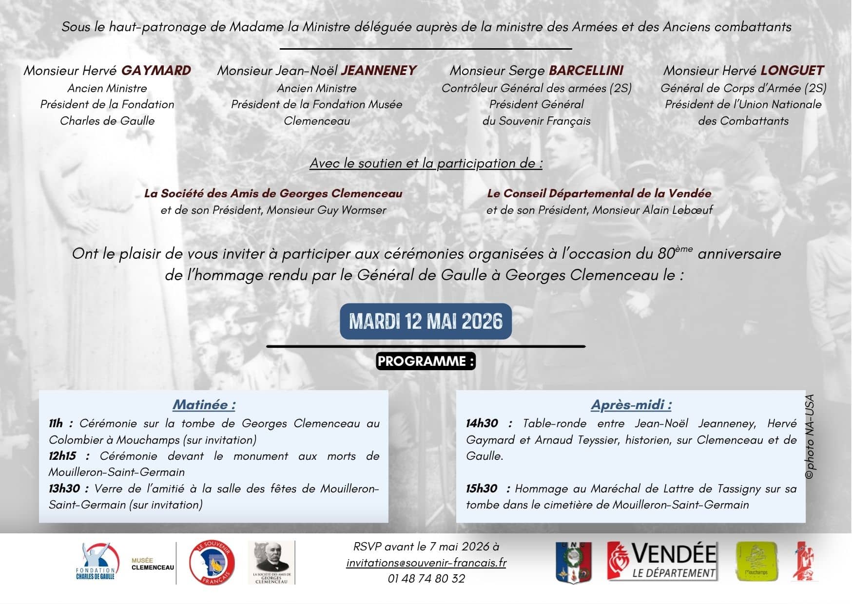 Le Souvenir Français consacre son mois de mai à la rencontre intellectuelle et patriotique entre Charles de Gaulle et Georges Clemenceau, à l’occasion du 80ème anniversaire de la visite du Général sur la tombe du Tigre en Vendée, le 12 mai 1946. À cette occasion, Le Souvenir Français s’est associé avec la Fondation Charles de Gaulle, la Fondation Musée Clemenceau, la Société des Amis de Georges Clemenceau ainsi que l’Union Nationale des Combattants, afin de mettre en lumière cet événement autour du programme suivant :