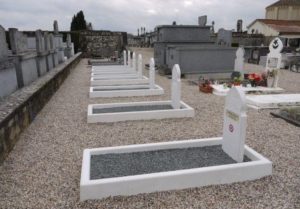 Durant la Première Guerre mondiale, la France tente au mieux de respecter la confession religieuse des mobilisés et tout particulièrement pour les rites funéraires. Lors de la conception des stèles funéraires des nécropoles et carrés militaires, les autorités définissent quatre modèles de tombes confessionnelles, tenant compte des principaux cultes. La stèle musulmane, orientée vers la Mecque, est en forme d’arc outrepassé, caractéristique de l’architecture religieuse d’Afrique du Nord et du Moyen-Orient. Un croissant et une étoile (symboles de l’Islam) sont gravés en son sommet, surmontant une mention variable en arabe : “Qu’Allah accorde sa miséricorde”, “pour cet homme qui est mort” ou parfois un verset du Coran. Il est à noter que ce modèle de stèle a également été utilisé pour des soldats d’Afrique subsaharienne et d’Indochine non musulmans.