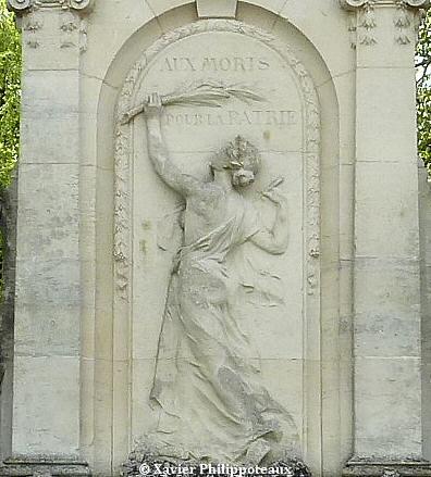 Le fronton est gravé de l’inscription « Souvenir Français ». En-dessous, sur la façade principale, une petite alcôve abrite un bas-relief d’une femme brandissant les palmes de la victoire et de la gloire, surmonté de l’inscription : « Aux morts pour la patrie ».