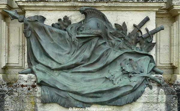 Sur le socle sont représentées des armes de guerre, un casque, un drapeau et des palmes en bronze, figures allégoriques de la victoire.