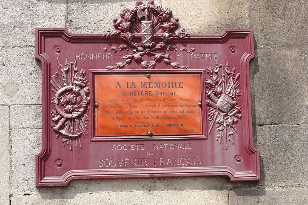 Onésime Hélère est né en 1844 à Villemer dans l’Yonne. Lorsque la guerre de 1870 éclate, il est mobilisé au sein du 1er régiment d’artillerie montée. Fait prisonnier lors de la bataille de Sedan dans les Ardennes le 1er septembre 1870, il s’évade et rejoint Vignot, dans la Meuse, où il décède le 20 septembre 1870. La plaque de Vignot rappelle son sacrifice ainsi que celui des 139 000 soldats morts durant le conflit contre l’Allemagne.
